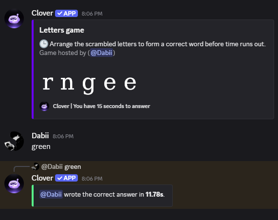 Order from chaos! Letters is a classic anagram puzzle where the bot tosses a salad of characters at you, and you have to make sense of them.