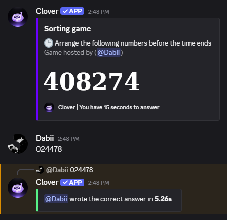 The bot will present a scrambled sequence of numbers (for example, 408274). Your task is to mentally sort these digits in ascending order (from smallest to largest) and type the newly arranged sequence into the chat (e.g., 024478).