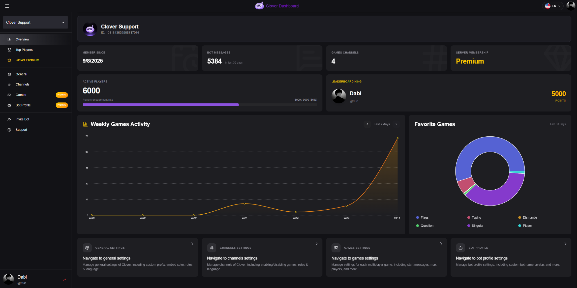 Gone are the days of relying solely on complicated bot commands. You can now manage Clover entirely from our visually stunning web interface.