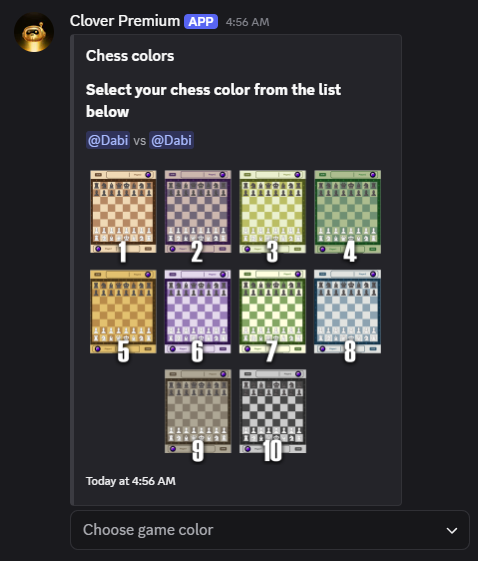 .chess @userto challenge a specific opponent. The entire game is seamlessly playable using interactive Discord buttons. Clover handles the board state, legal moves, and checkmates automatically.